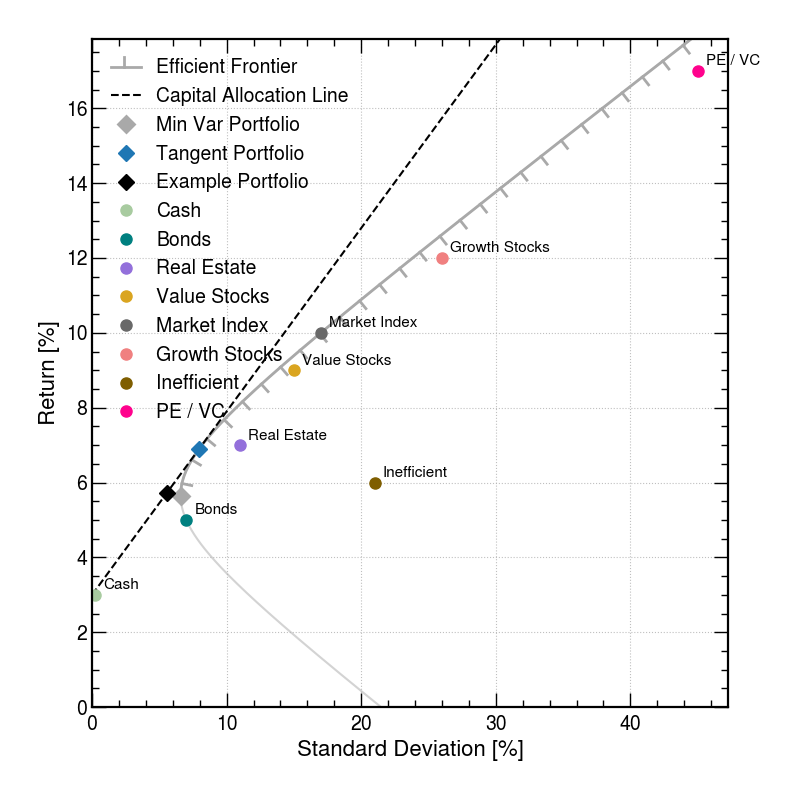 There are two efficient portfolios of note: the minimum variance portfolio, \(\vec{w}_\mathrm{min}\), and the tangent portfolio, \(\vec{w}_\mathrm{tan}\).